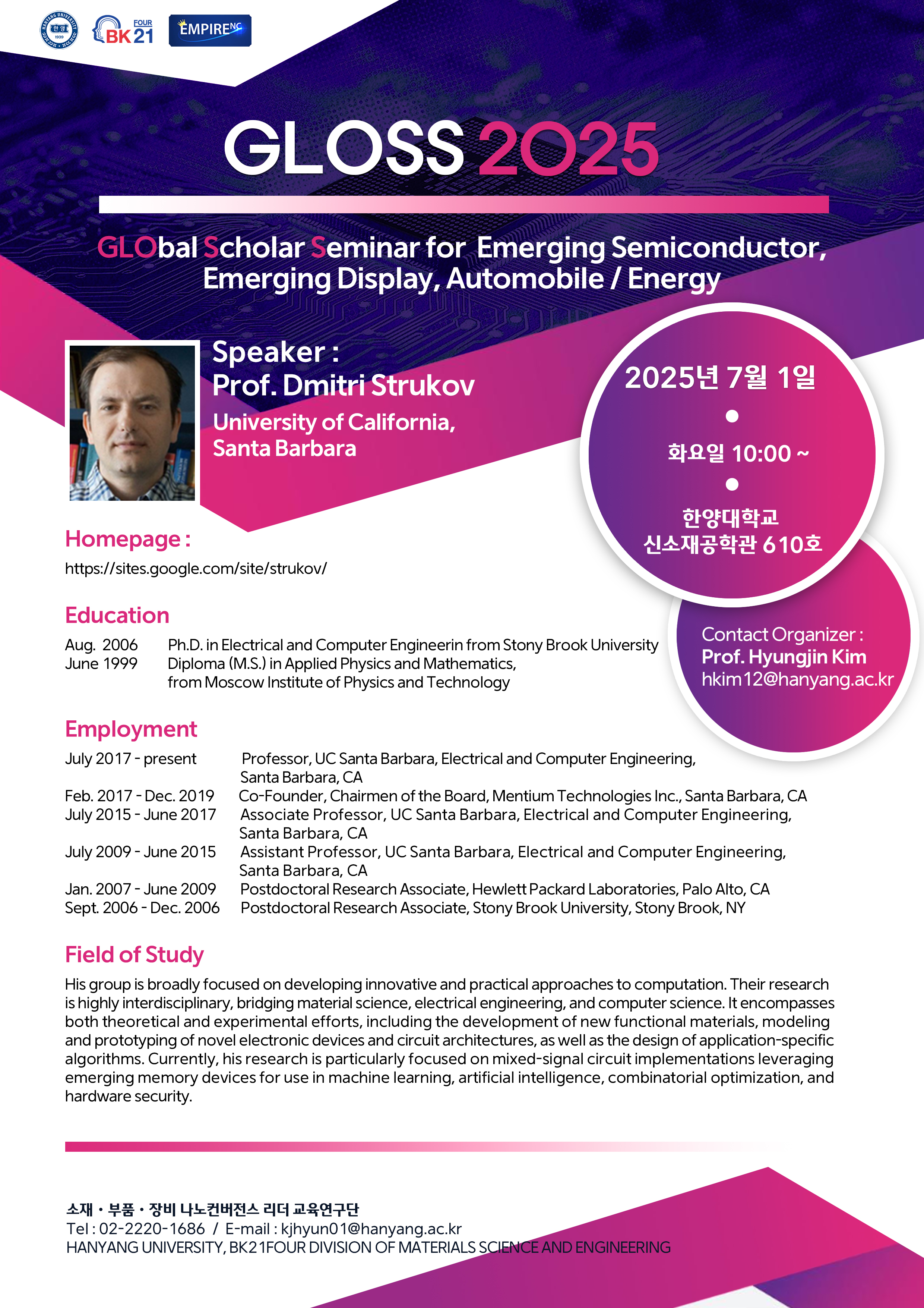 GLObal Scholar Seminar (GLOSS) for Emerging Semiconductor, Display, Automobile, and Energy ■ 일시: 2025.07.01.(화) 10:00~ ■ 장소: 신소재공학관 610호 ■ 연사: Prof. Dmitri Strukov (University of California, Santa Barbara) ■ 강연주제: In-Memory Computing Hardware Accelerators for Combinatorial Optimization ■ Contact Organizer: Prof. Hyungjin Kim (hkim12@hanyang.ac.kr)