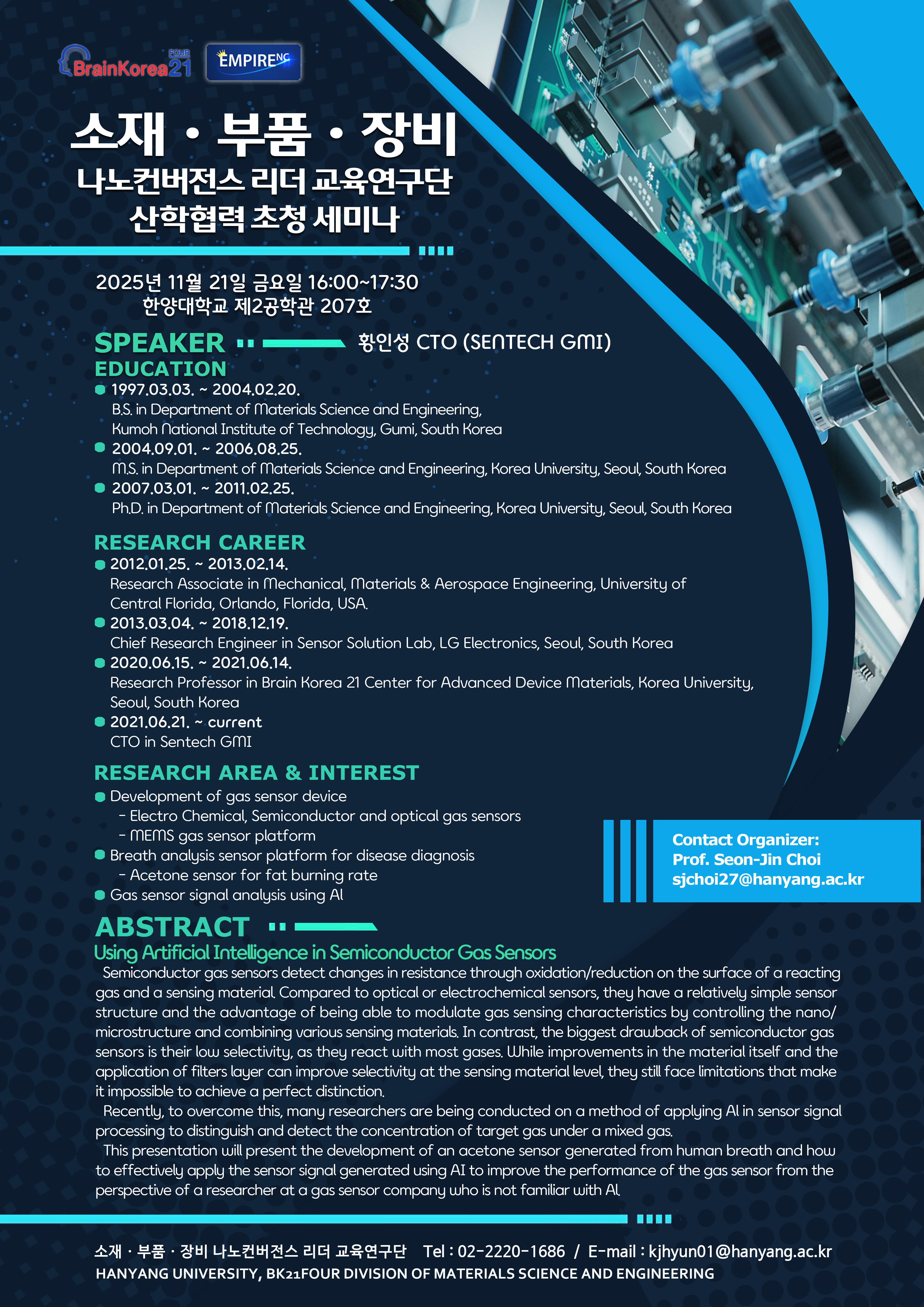 ■ 일시: 11/21(금) 16:00~17:30 ■ 장소: 제2공학관 207호 ■ 연사: 황인성 CTO (SENTECH GMI) ■ 강연주제: Using Artificial Intelligence in Semiconductor Gas Sensors